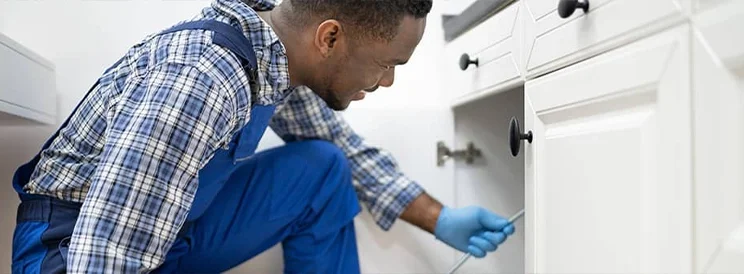 • Fix-It Construction Services technician performing drain cleaning under kitchen sink Harrisonburg VA